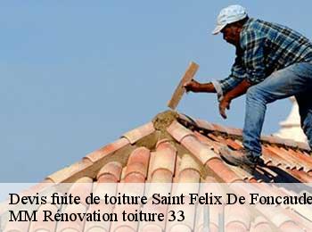 Une infiltration d’eau entre les tuiles demande la réalisation de travaux de réparation fuite de toiture 33540 au plus tôt, notamment si vous voulez retrouver un total confort dans votre maison et ne plus avoir à craindre les intempéries. Vous êtes consentent au fait de remettre en état votre toiture pour retrouver sérénité en toute circonstance ? Engagez le couvreur pour réparer fuite de toiture MM Rénovation toiture 33. Pour ce faire, demandez au préalable votre devis réparation fuite de toiture à Saint Felix De Foncaude. C’est entièrement gratuit et à demander en ligne, simplement.
